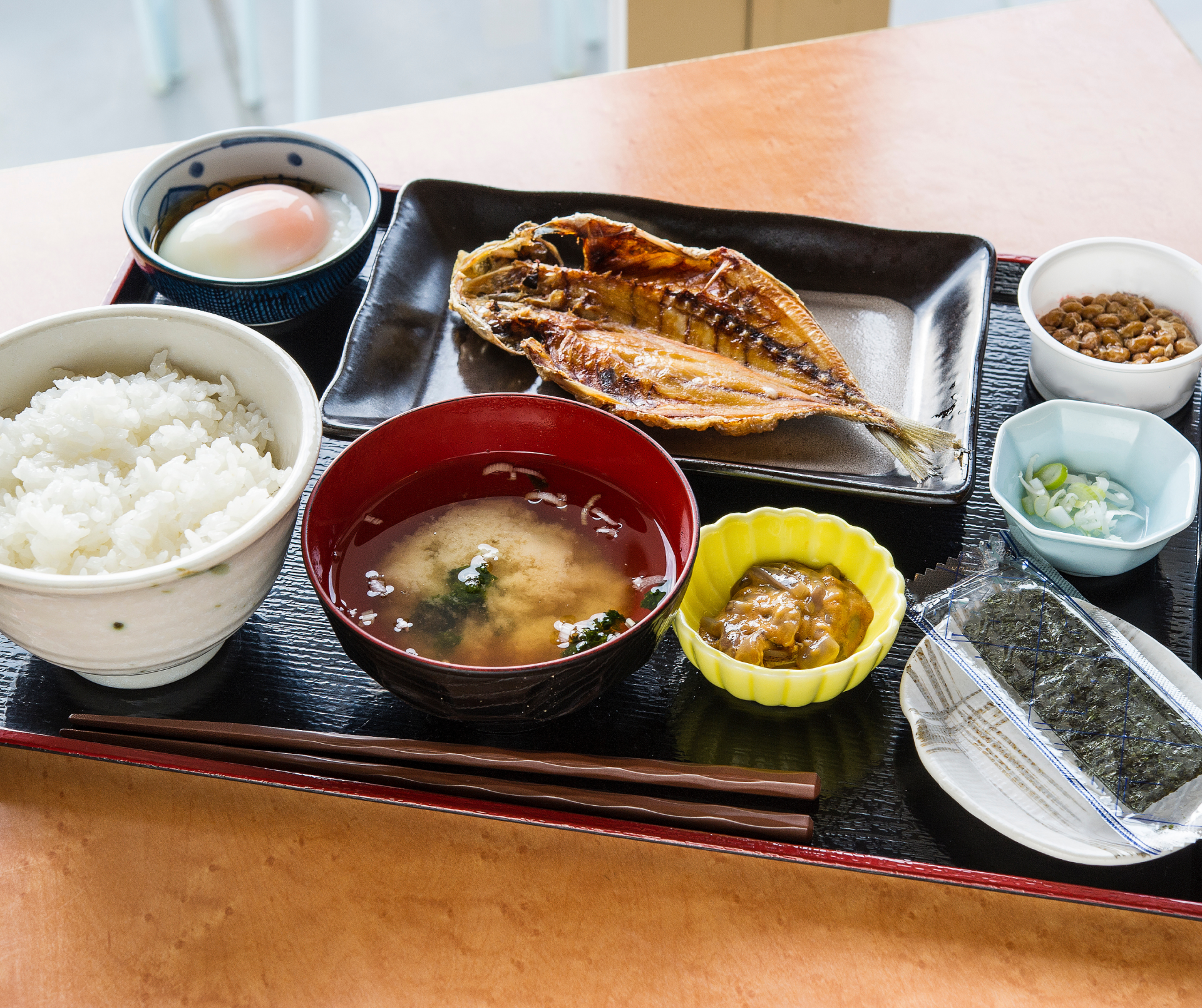 - Japanese Breakfast - Steamed rice, miso soup, cooked fish, pickled vegetables, tofu, boiled eggs, and tea.