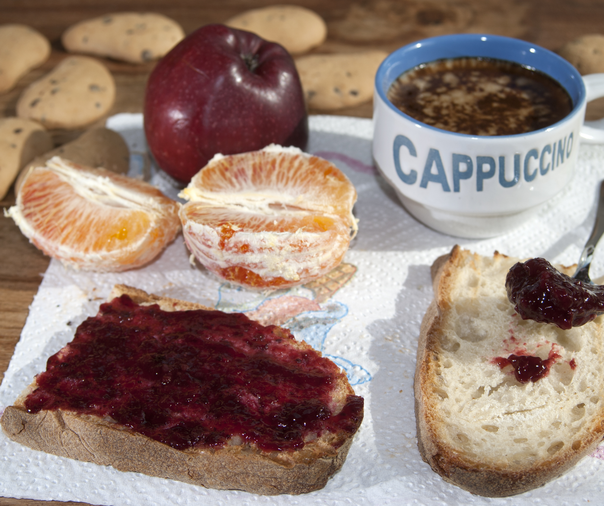 - Italian Breakfast - Cappuccino or latte, bread with butter and jam, cookies, biscuits, and pastries.