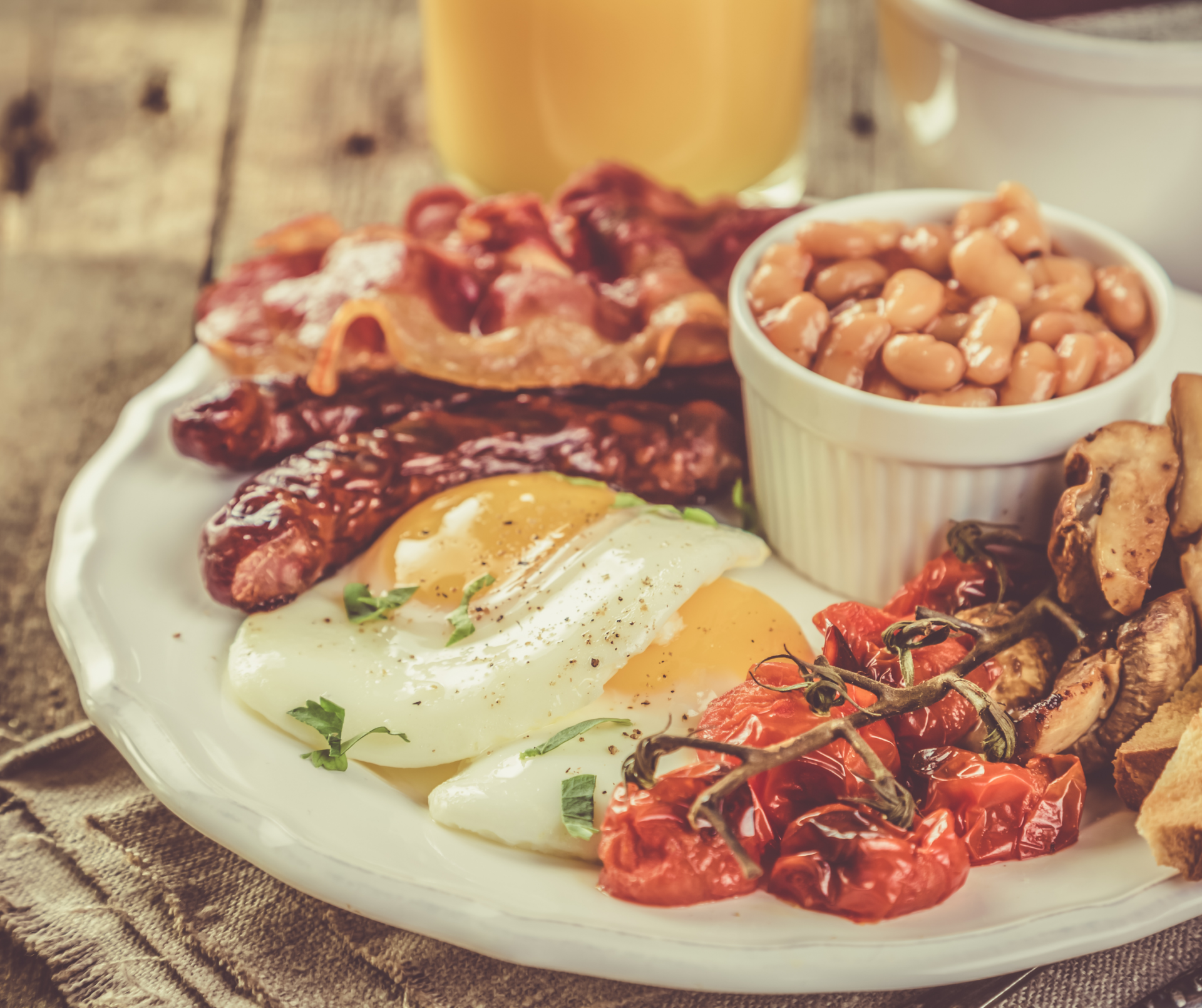 - Full English Breakfast - Scrambled eggs, sausage, bacon, baked beans, black pudding or white pudding, grilled tomatoes, mushrooms, potatoes, toast, and tea.