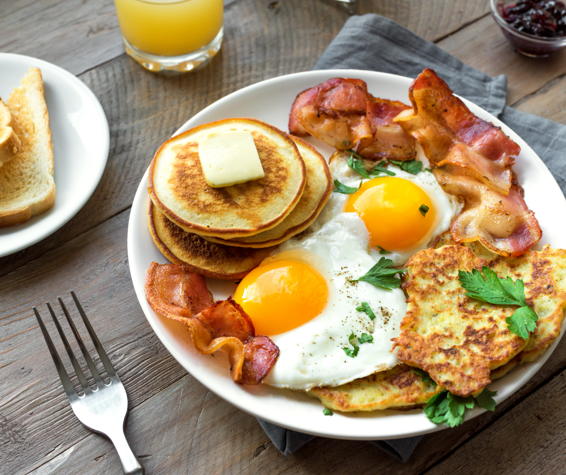 - Full American Breakfast - Large portion of eggs, breakfast meats such as bacon or sausage, potatoes or hashbrowns, pancakes or waffles, toast, and coffee.